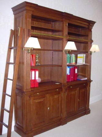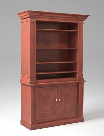 Mebel monumentalny, bogato zdobiony. Zarówno w części dolnej jak i nadstawce wystepują szerokie ryflowane pilastry zwieńczone wysokim gzymsem. Część dolna zamknięta. Biblioteczka skonfigurowana z biurkiem z naszej oferty będzie doskonałym wyposażeniem gabinetu. Mebel wykonany z drewna olchowego lub dębowego wybarwianego według naszej palety wybarwień. Możliwość wykonania biblioteczki w dowolnych wymiarach. Termin dostawy: 6 tygodni.